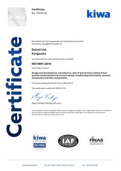 All Dekati operations are in compliance with the Quality Management Standard ISO 9001:2015 within the scope of: “Design and development, manufacture, sale of and services related to fine particle measurement and aerosol sample conditioning instruments, sensors, accessories and their components”.